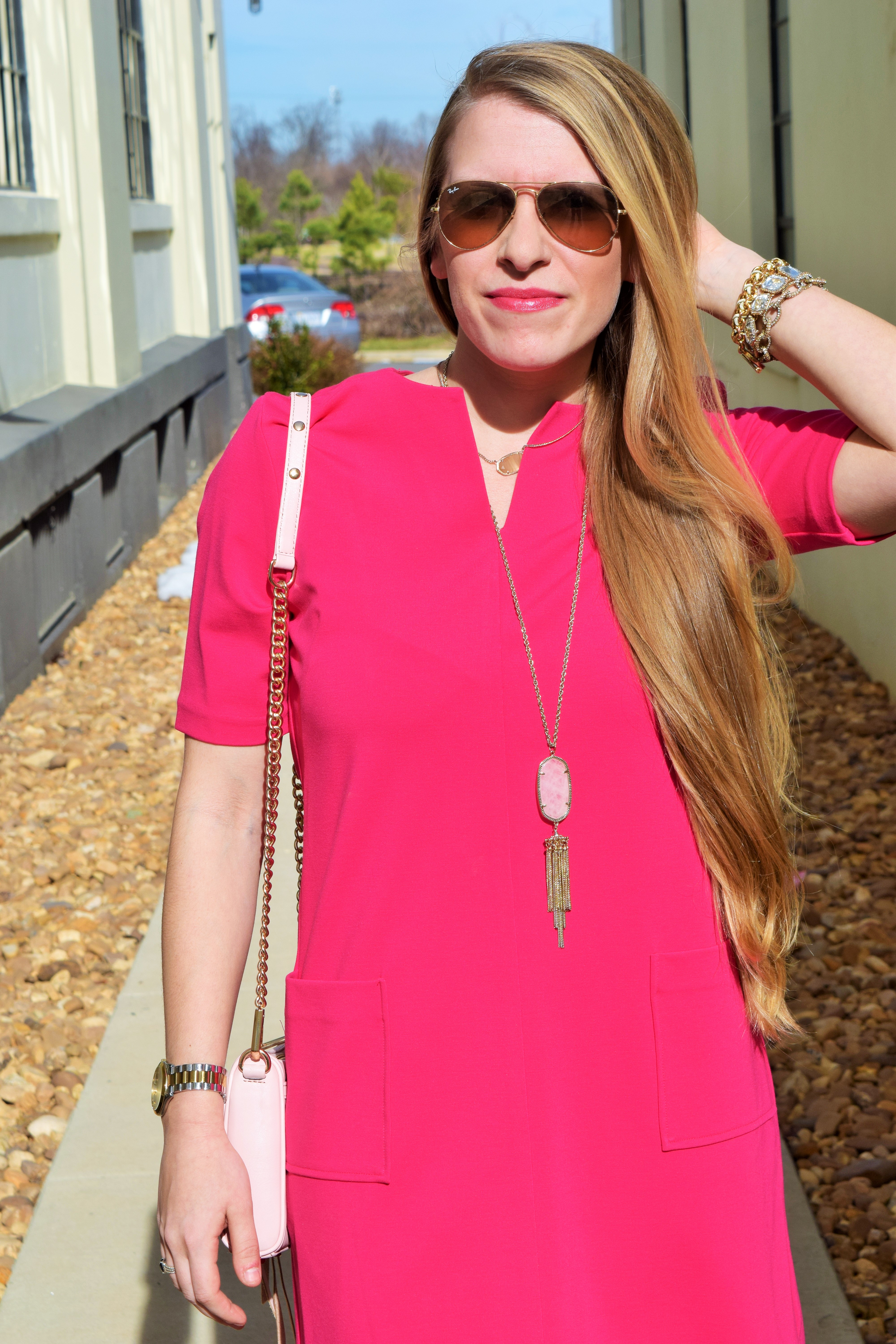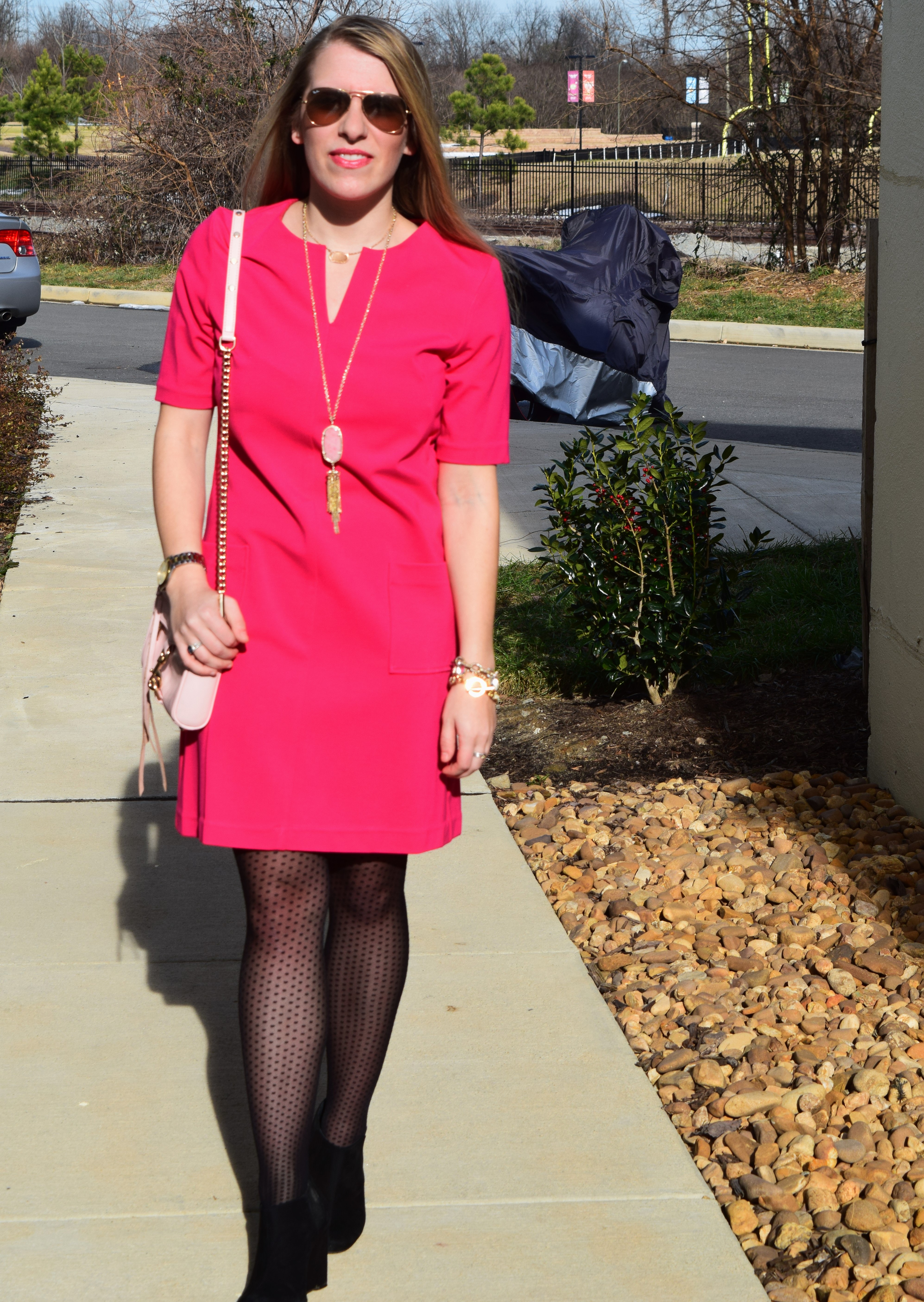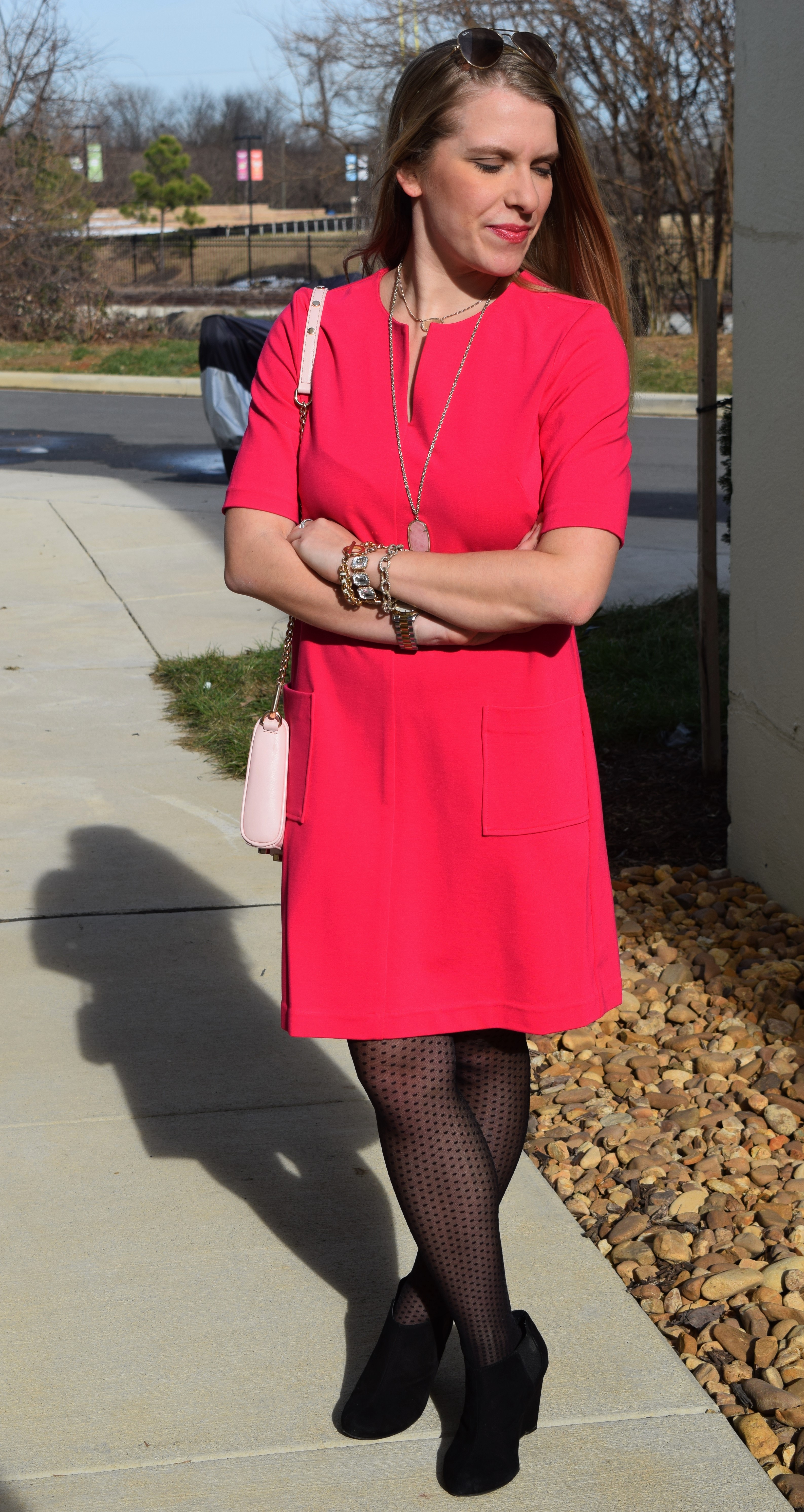 Elizabeth Mckay Gwyneth Dress (I love these dresses that are under $50 – one and two are similar to my dress above, three, four) / Jcrew Factory Polka Dot Tights / Booties, old (similar) / Rebecca Minkoff purse / Kendra Scott necklaces (Rayne and Dylan) / Bracelet