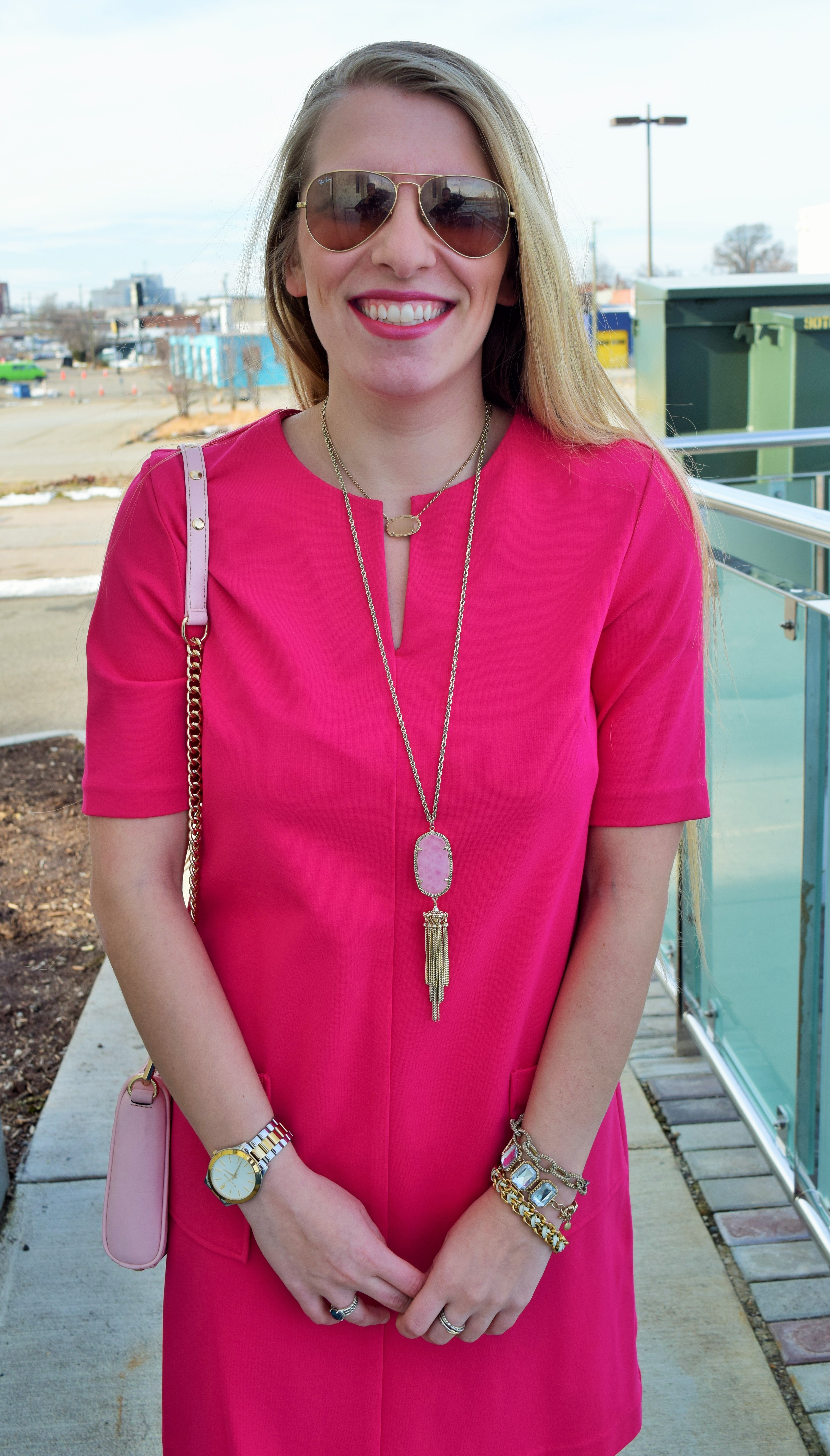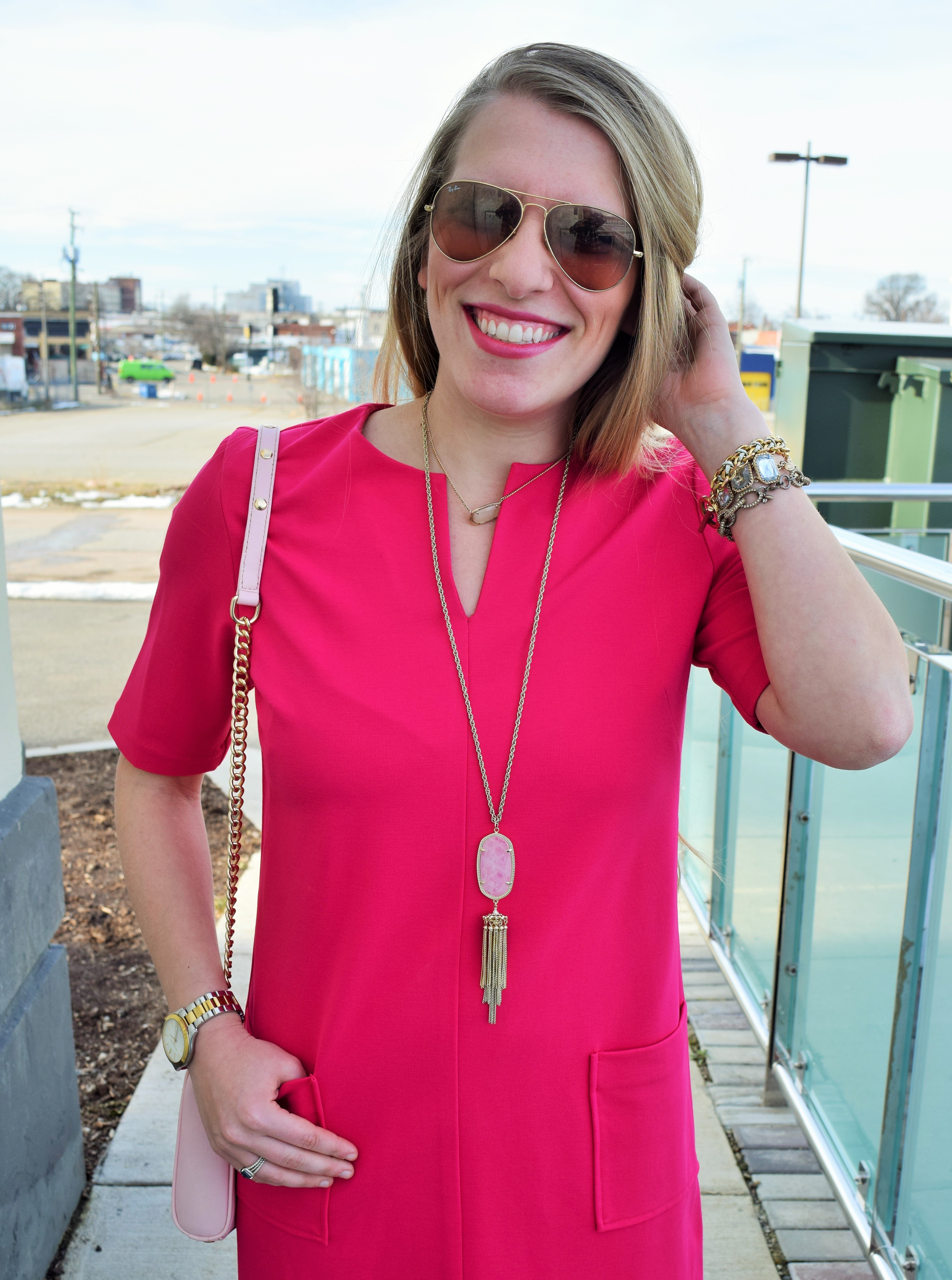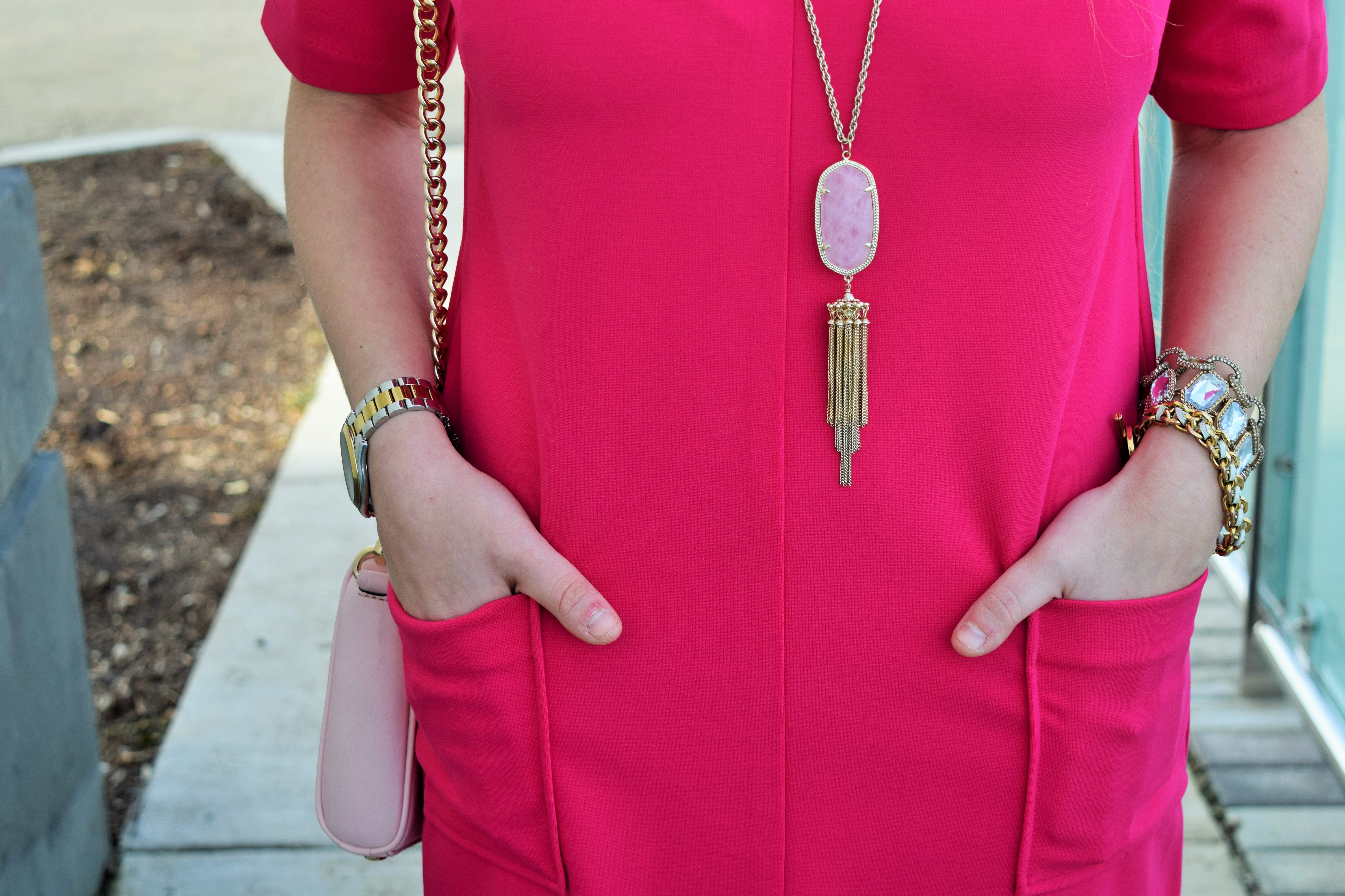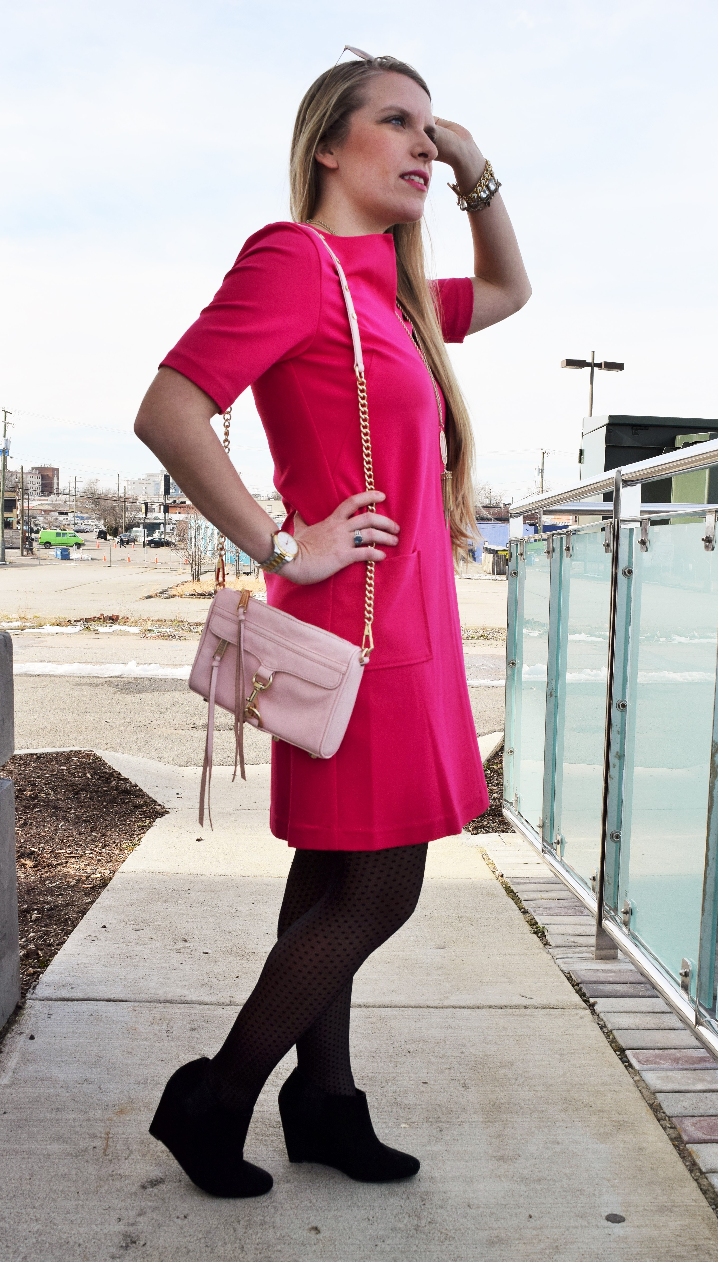 Happy Monday friends! I can’t believe another weekend has flown by…where has the time gone? Valentine’s Day will be here before we know it, so today I wanted to share with ya’ll a perfect hot pink dress for this special day. If you’ve been following along, you might remember my latest obsession with Elizabeth Mckay. Well friends, once again I am blown away with the quality and fit of this Elizabeth Mckay Gwyneth dress. I love how thick and structured the material is, which is perfect for chillier weather. This dress pairs well with tights (like these polka dot ones below!) but would also look really cute with flats or pumps.
