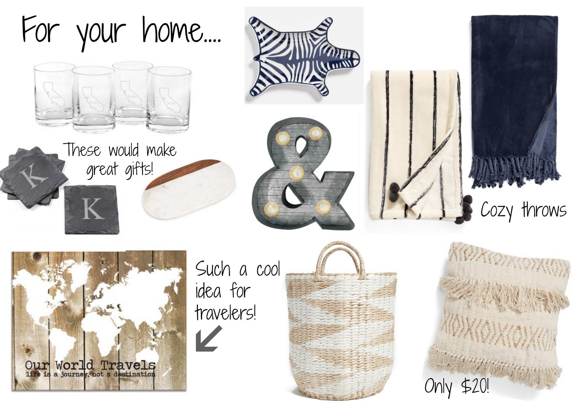 Home State Glasses (under $30!) / Monogram Coasters / Marble & Wood Board / Porcelain Dish / LED Marquee / Striped Throw (how cute are those pom poms?!) / Plush Throw / Wall Art (LOVE this idea!) / Straw Basket / Throw Pillow (super cute!)