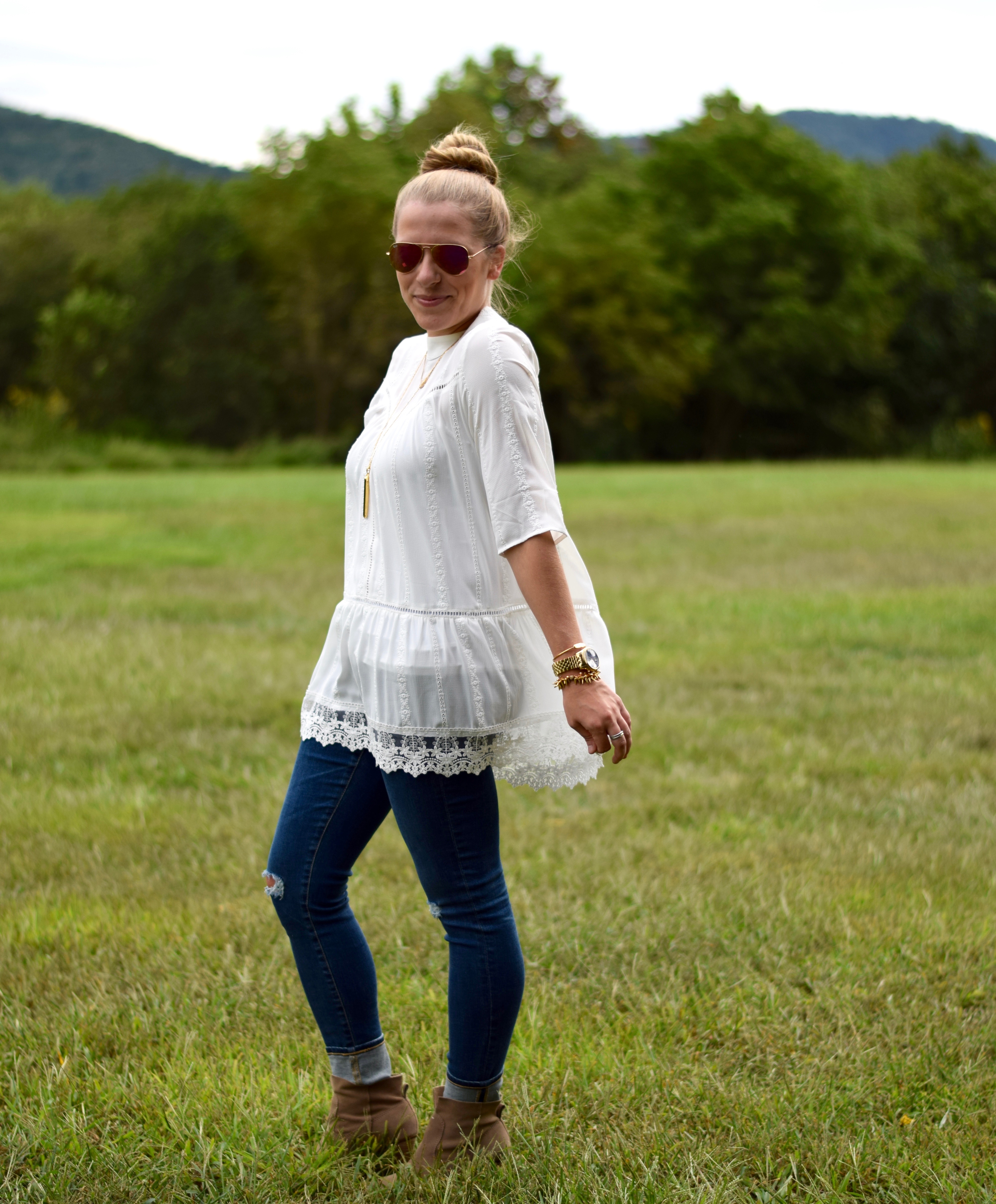 White Lace Top (sold out, but I adore this option for $18) / Favorite Ripped Skinnies (on sale!) / Booties (highly recommend, super comfy & versatile) / Rebel Pendant