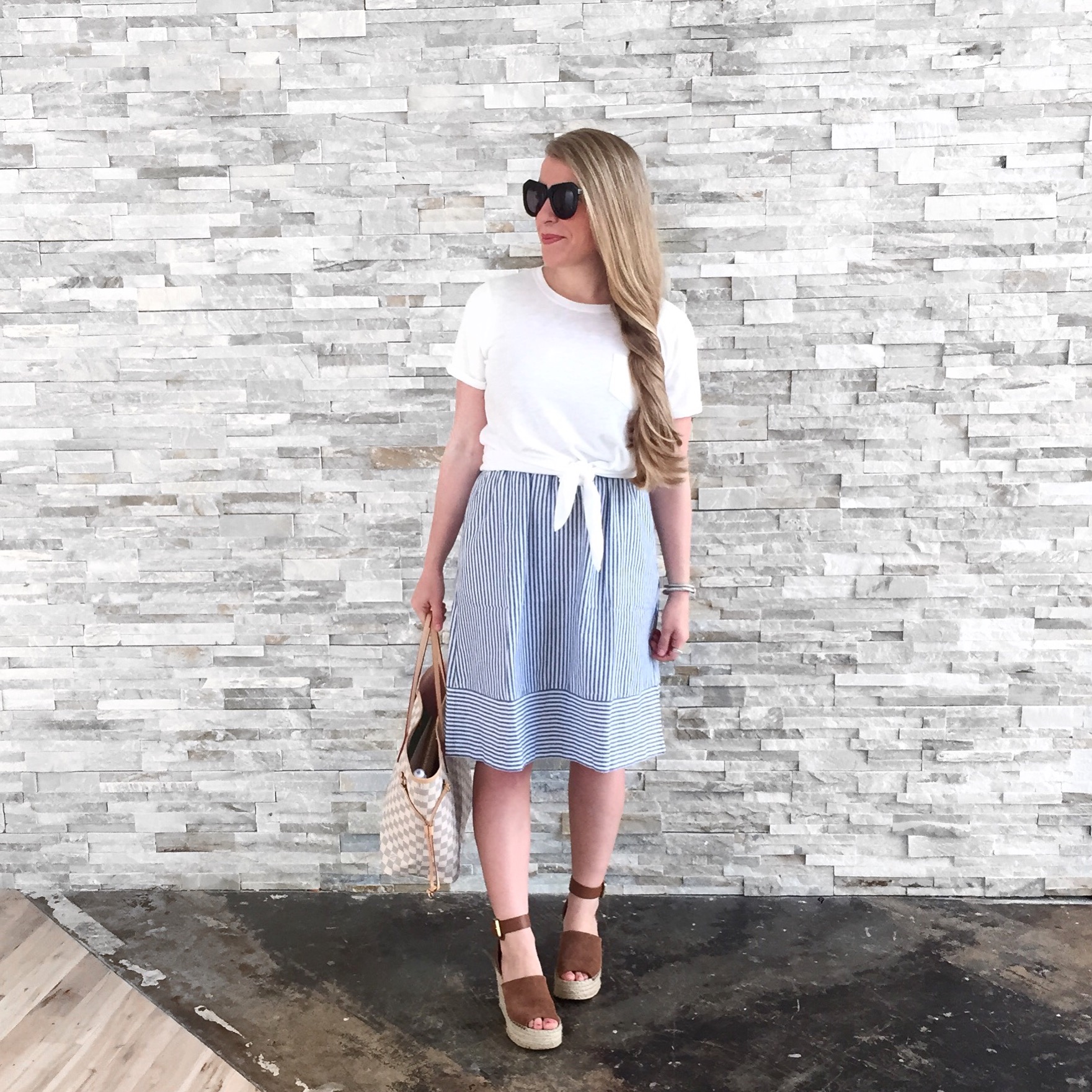 Tie-Waist Tee / Striped Midi Skirt (even better, the waist is elastic!)