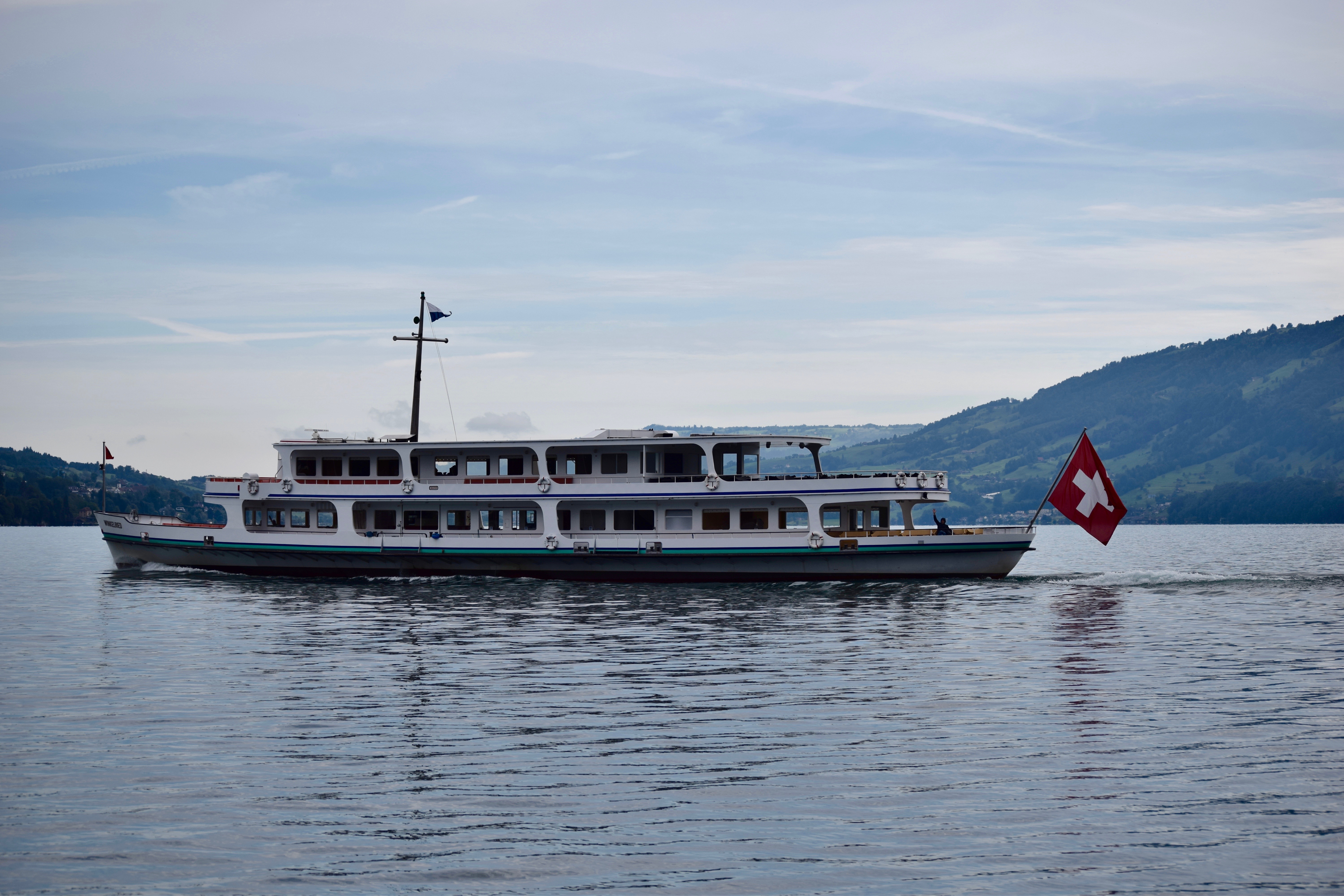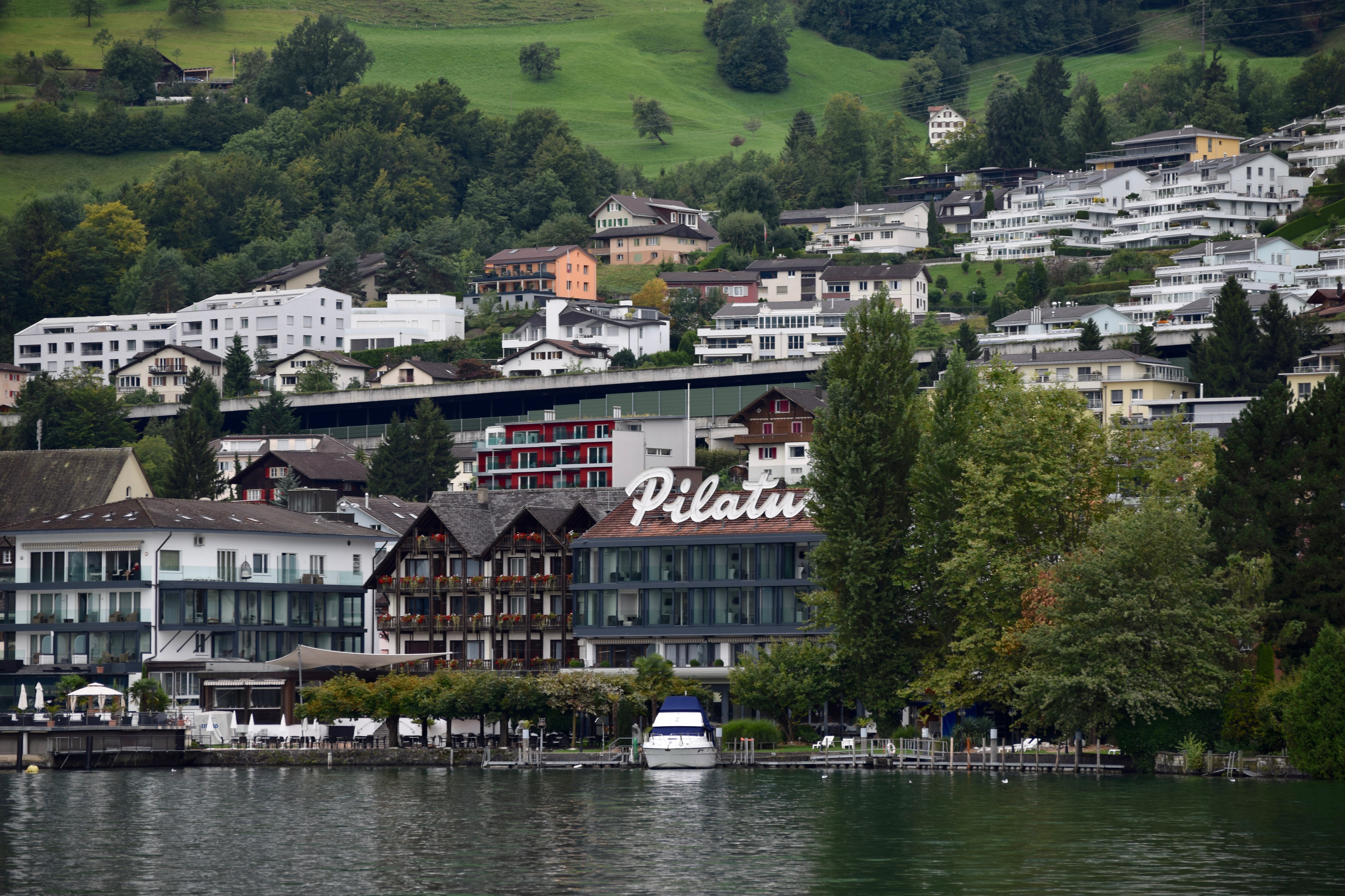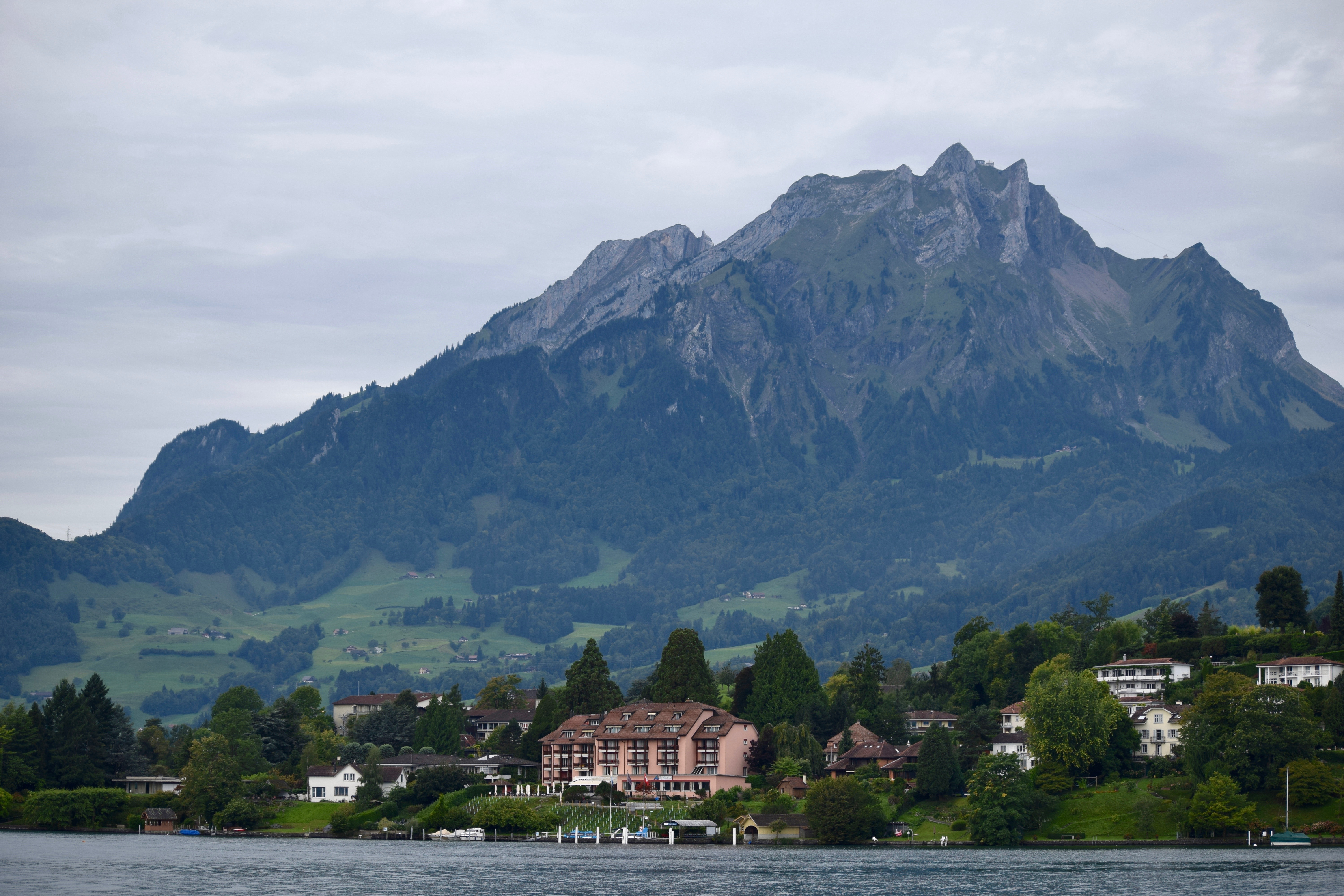 We decided to start the 'Golden Round Trip' with a boat ride on Lake Lucerne. The boat was docked next to the train station which was super convenient, and the ride took us to Alpnachstad about an hour away.